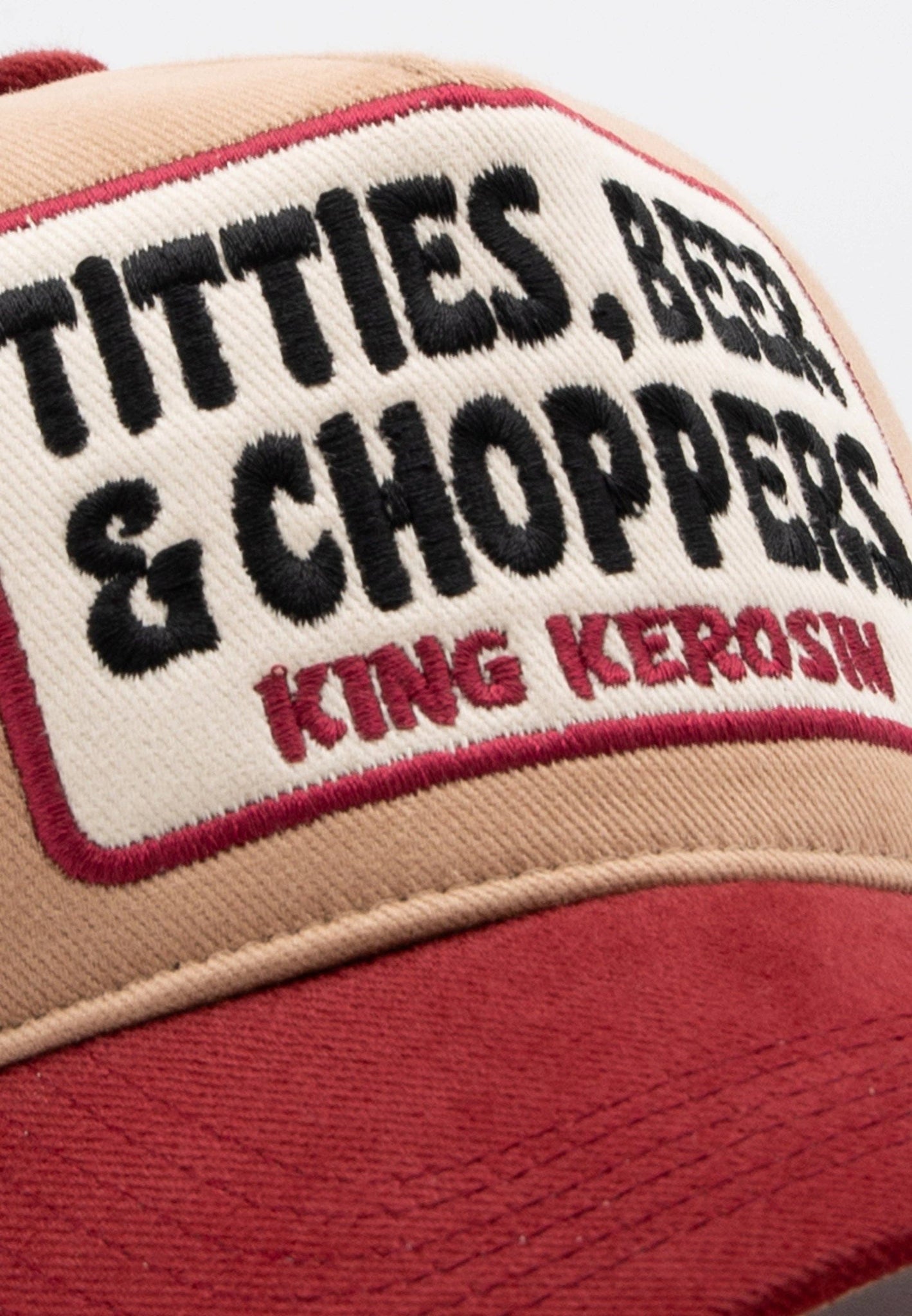 Denne cap er en erklæring for chopper-kørere: højlydt, ærlig og kompromisløs. Med den fede broderede patch "Titties, Beer & Choppers" rammer King Kerosin plet på, hvad der er vigtigt.