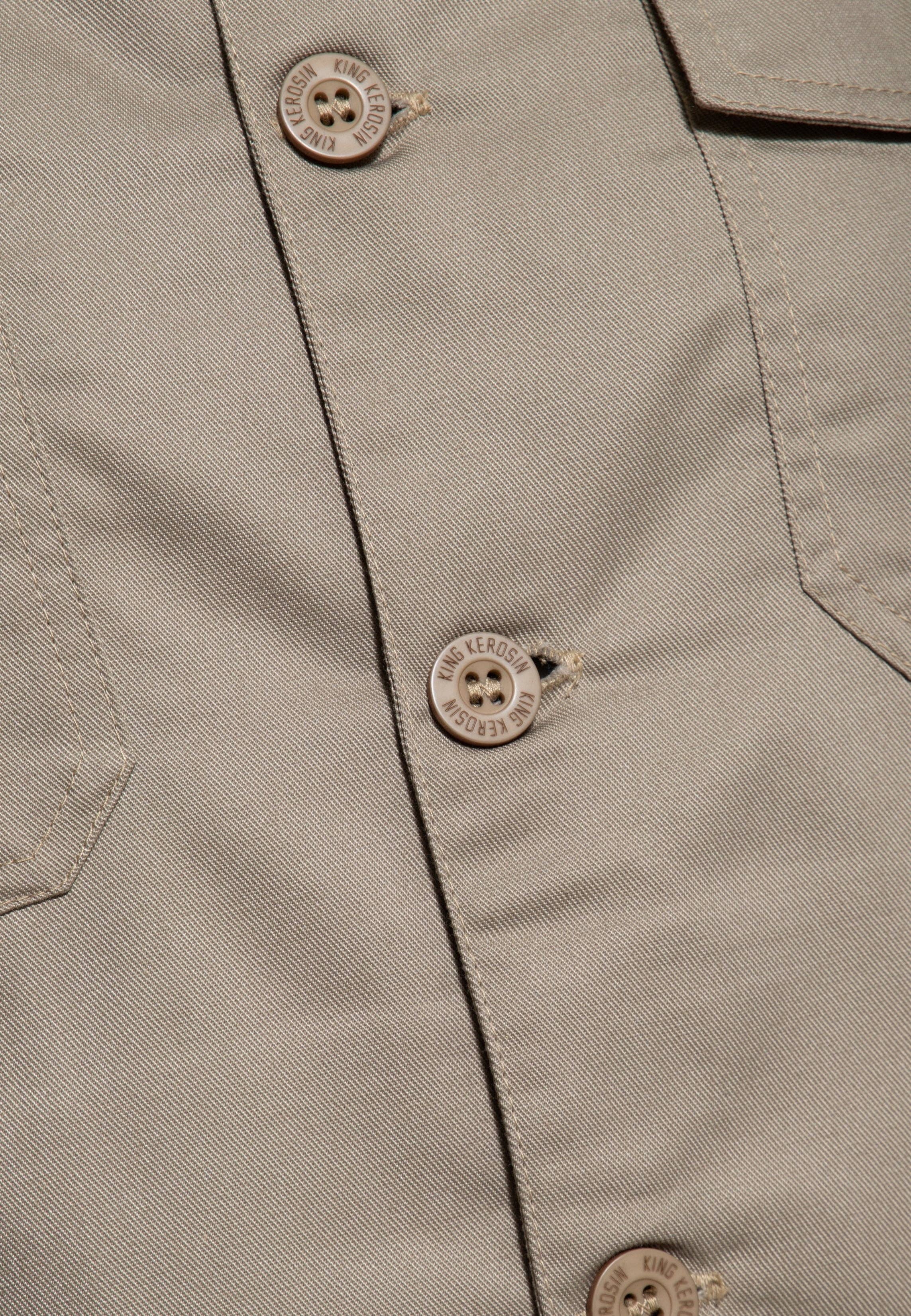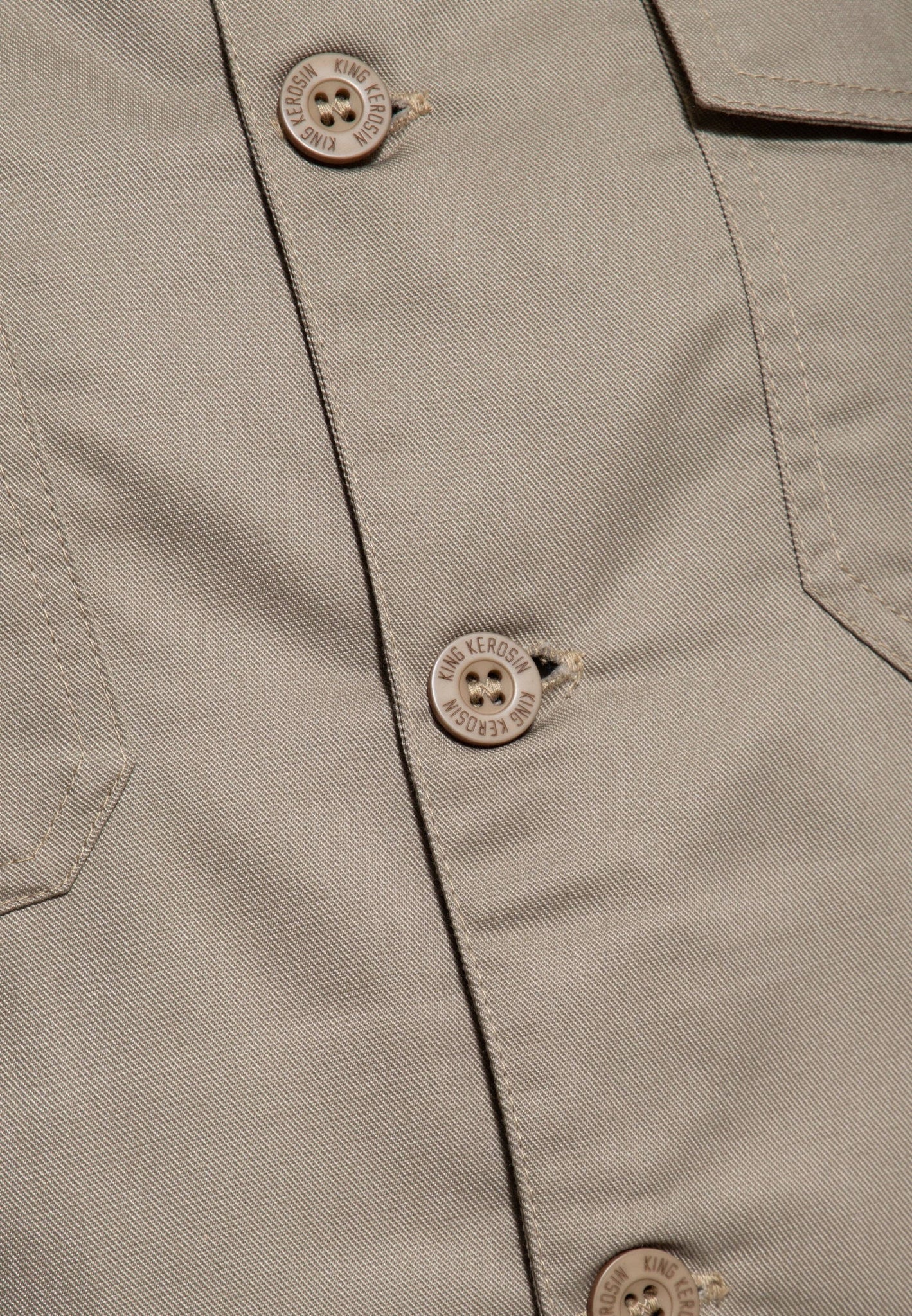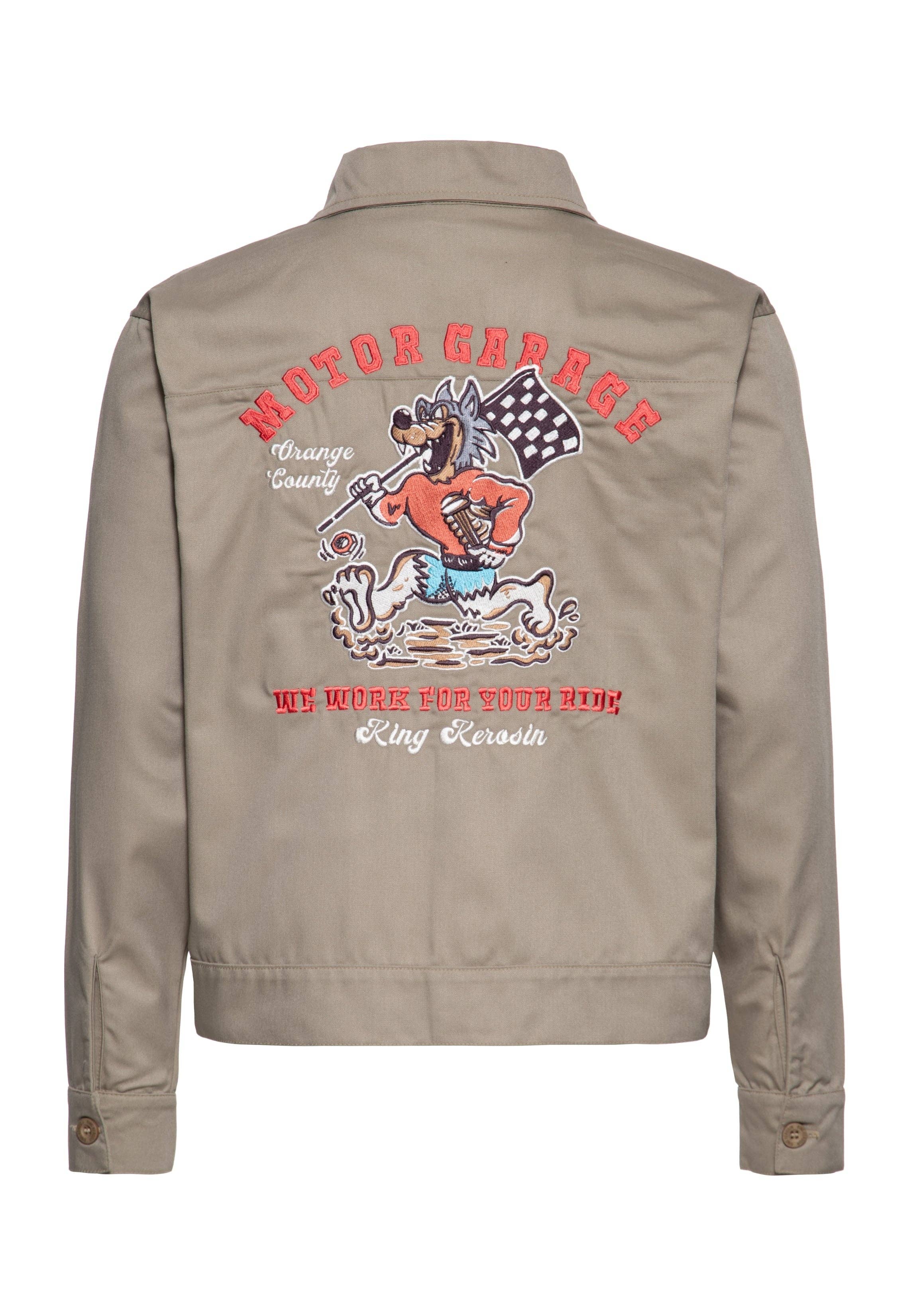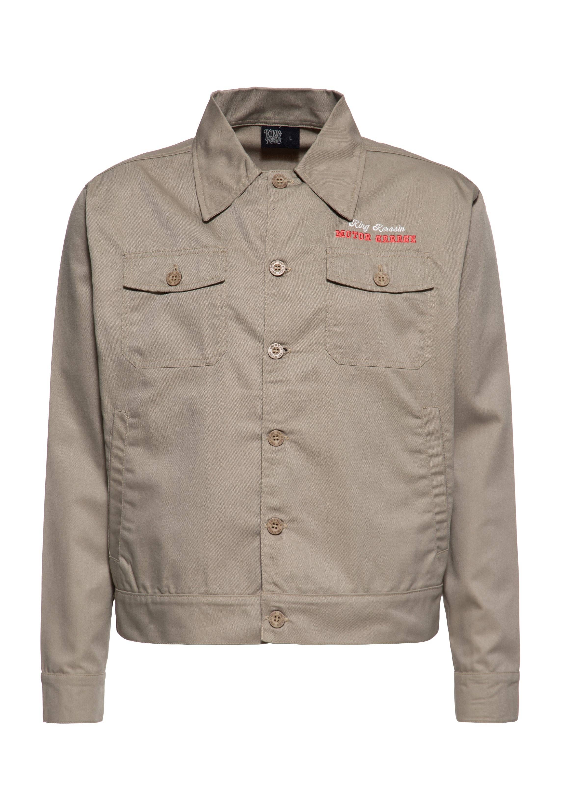Foran sørger den broderede skrift "King Kerosin Parts and Services" for en harmonisk detalje. Fremstillet af let, slidstærk bomuldstwill præsenterer jakken sig i en kort Regular Fit med Kent-krave, knaplukning og brystlommer.