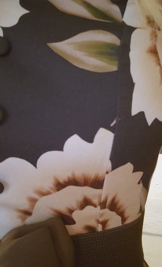 Den er med 3/4 ærmer og har selvfølgelig lommer. Lynes i ryggen.