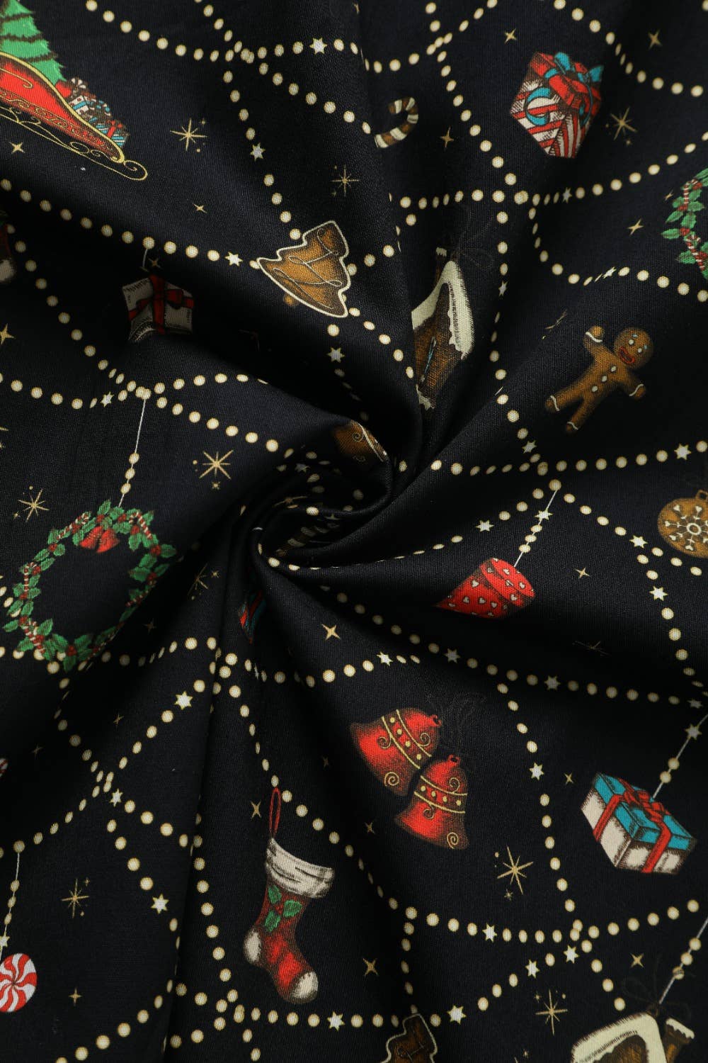 Dette legende, men sofistikerede stykke har et blødt sort stof dekoreret med fortryllende illustrationer af den drilske Julepynt.