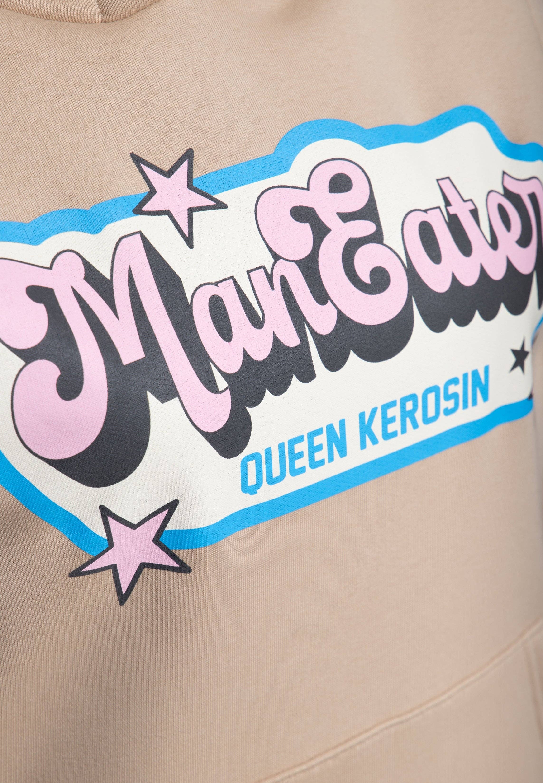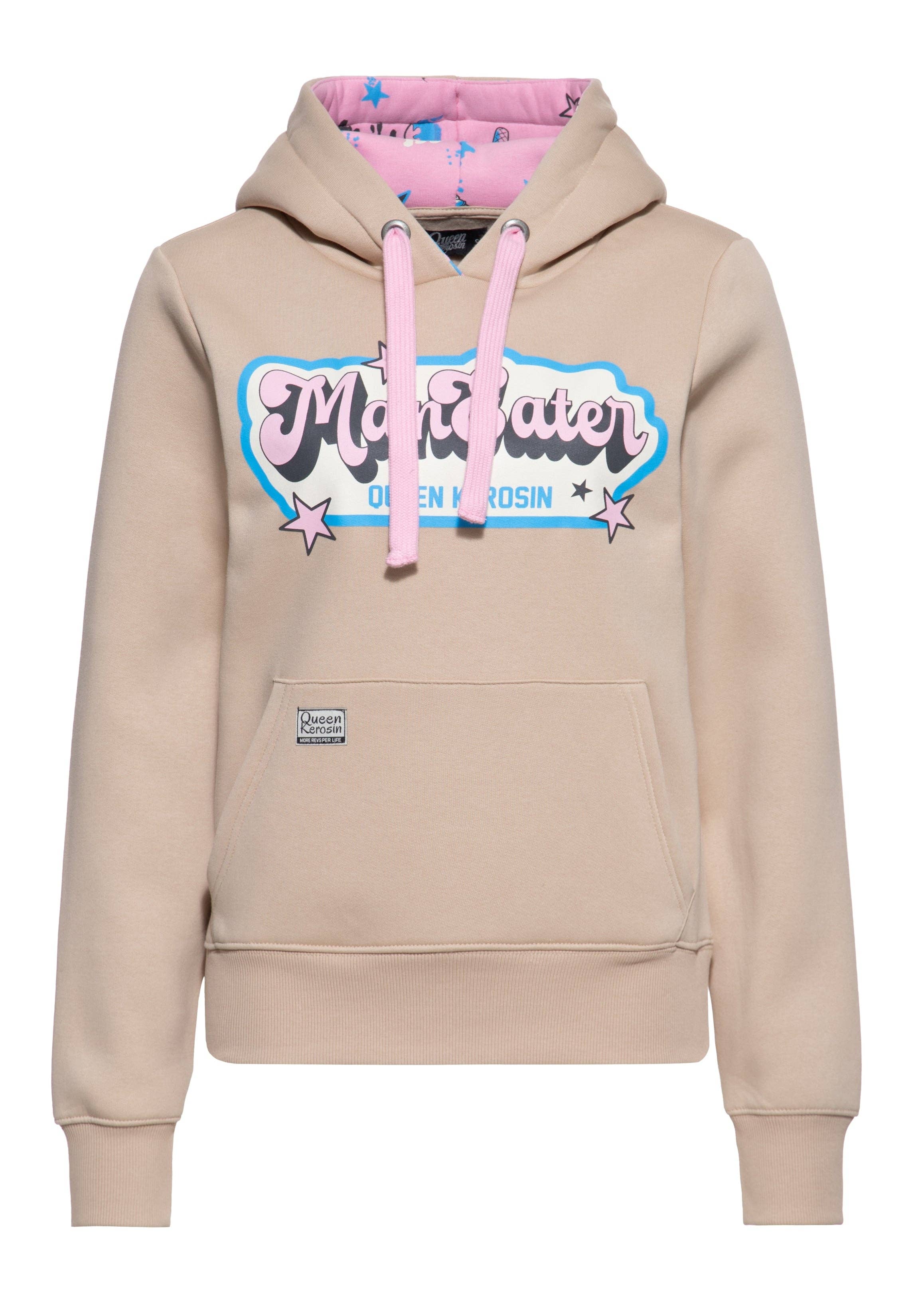 Med Queen Kerosin hættetrøjen "Man Eater" sætter du en uundgåelig erklæring! Det iøjnefaldende frontprint i retro-look suppleres med lyserøde snore og et unikt hættefor med frække motiver. Fremstillet af blødt bomuldssweat-blandingsstof giver den dig den bedste komfort i hverdagen.